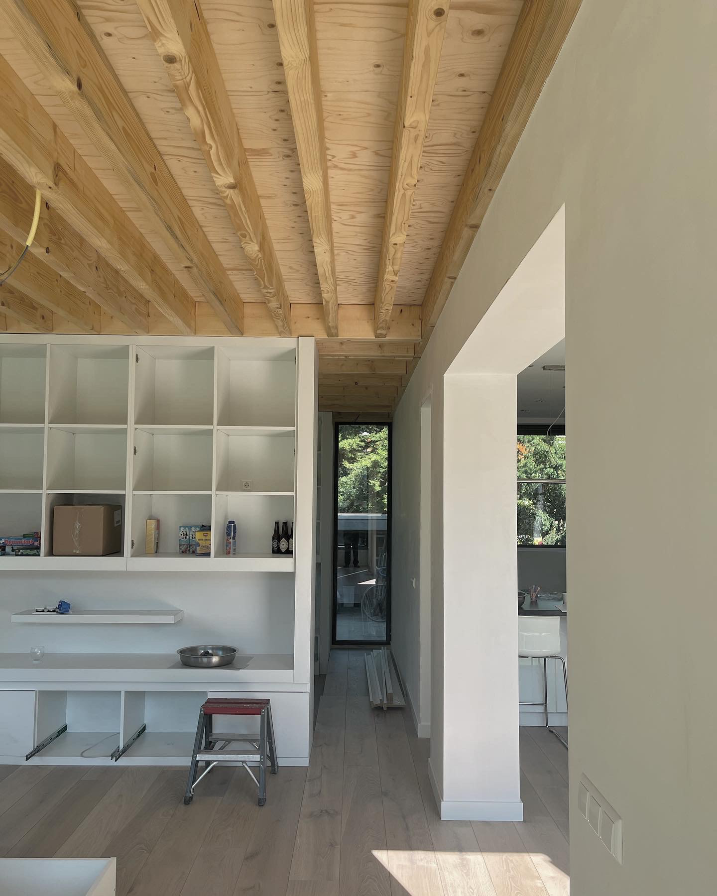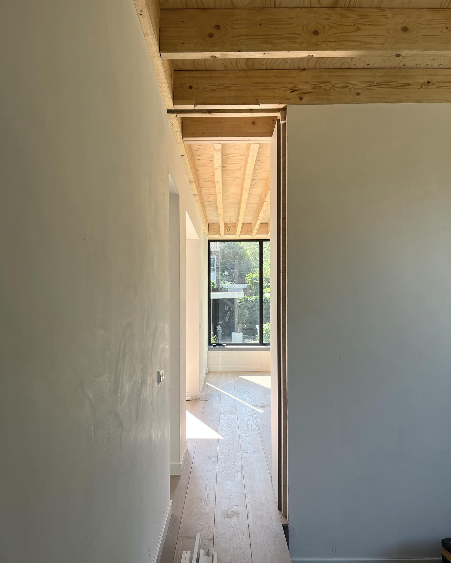 Binnen speelt de constructie een belangrijke rol in de ruimtelijke beleving. Het plafond van de uitbreiding bestaat uit een zichtbare houten balkenstructuur die warmte en ritme aan de ruimte geeft. Samen met het zachte daglicht en het uitzicht op de tuin ontstaat een rustige, bijna paviljoenachtige woonruimte.