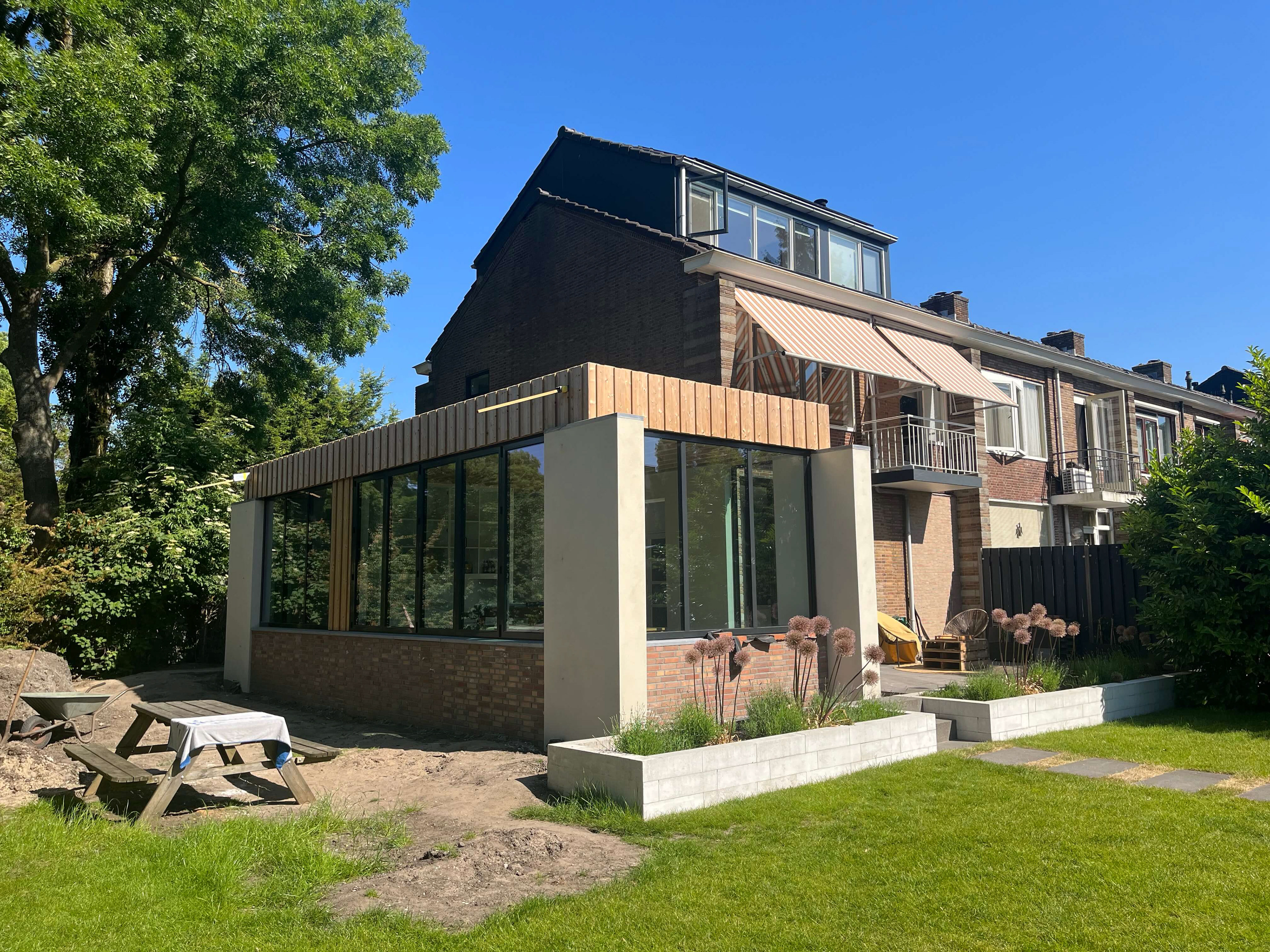 Voor deze woning aan de Meidoornlaan is een compacte uitbreiding ontworpen die het bestaande huis opnieuw verbindt met zijn omgeving. Waar de oorspronkelijke woning zich relatief gesloten tot de tuin verhield, opent de nieuwe toevoeging het huis naar licht, groen en buitenruimte.