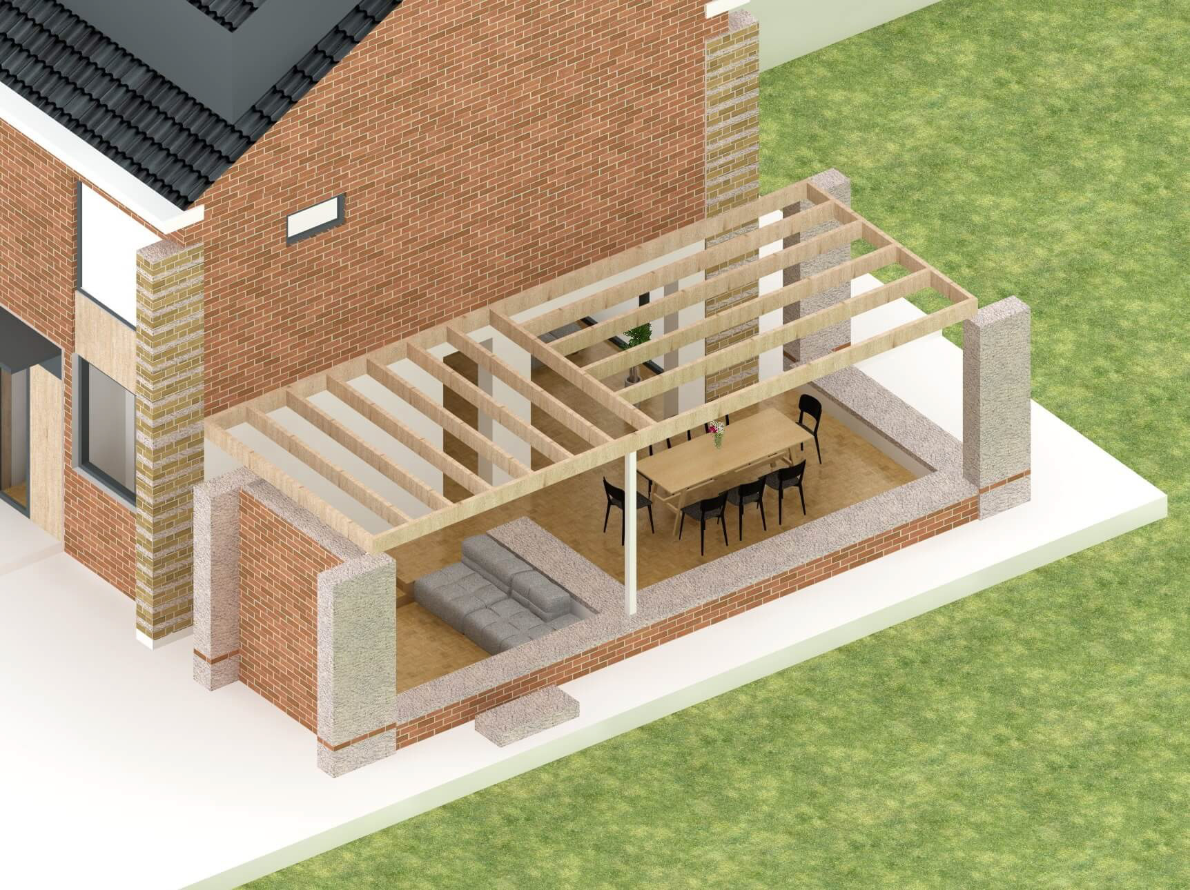 metselwerk, hout, aluminium kozijnen, glas