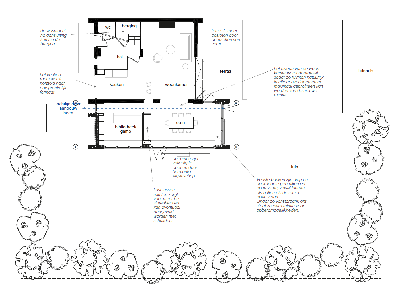 De uitbreiding vormt een helder en ingetogen volume aan de tuinzijde van de woning. Grote glasvlakken en een volledig te openen harmonicapui zorgen ervoor dat interieur en tuin in elkaar overlopen. De woonruimte kan hierdoor in de zomer volledig naar buiten worden uitgebreid, terwijl het huis in de winter toch beschutting en intimiteit biedt.